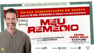 Já nos dias 25 e 26 de abril, sábado às 20h, e domingo às 18h, respectivamente, o público poderá conferir Meu Remédio, estrelado por Mouhamed Harfouch e dirigido por João Fonseca. Após temporada de sucesso no Rio de Janeiro, a peça chega a Osasco com uma narrativa leve e bem-humorada sobre origens, identidade e aceitação pessoal, equilibrando emoção e humor em uma experiência envolvente.