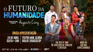 No dia 24 de abril, às 20h, o espetáculo O Futuro da Humanidade, inspirado na obra de Augusto Cury e com adaptação assinada pelo autor em parceria com Ingrid Zavarezzi, apresenta uma narrativa sensível sobre saúde mental, ética médica e os desafios enfrentados por pessoas com transtornos emocionais. Com direção de Rogério Fabiano, a montagem convida o público a refletir sobre empatia, preconceito e os caminhos possíveis para reencontrar esperança, amizade e sentido na vida.