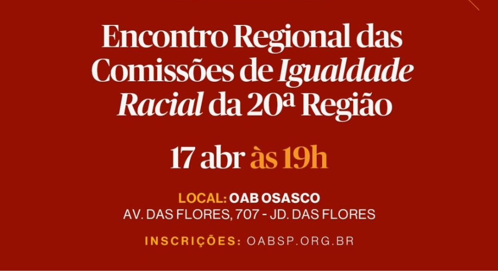 A Prefeitura de Osasco, por meio da Secretaria Executiva de Políticas de Promoção da Igualdade Racial (SEPPIR), realizará o Encontro Regional das Comissões de Igualdade Racial da 20ª Região da OAB/SP, no dia 17 de abril, às 19h, na sede da OAB Osasco (Avenida das Flores, 707 – Jardim das Flores).