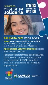 Encerrando a manhã, o Instituto CasaViva apresentará o projeto Mini Pomares Urbanos, conduzido por Raisa Alves, relações públicas e presidente do instituto desde 2024. Atua como educadora ambiental e articuladora de projetos de impacto social.
