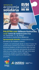 A programação inclui também a apresentação “A importância e os benefícios do trabalho coletivo”, por Edileuza Guimarães, com duração de 15 minutos. Atuante no setor de alimentação desde os 15 anos, Edileuza integra o movimento de Economia Solidária desde 2005, com foco em alimentação inclusiva e produção responsável.