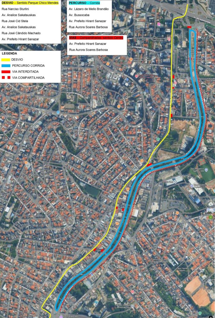 – Rua Narciso Sturlini – Avenida Analice Sakatauskas – Rua José Cid Stela – Novo trecho da Avenida Analice Sakatauskas – Rua José Cândido Machado – Avenida Hirant Sanazar (próximo ao parque). No retorno da corrida, sentido Centro, as vias serão compartilhadas: apenas uma faixa será destinada aos corredores, enquanto as demais permanecerão liberadas para o tráfego de veículos.
